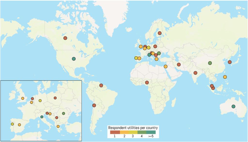 Geographical distribution of water utilities that responded to the Smart Water Survey. Colored circles represent the location of the 64 water utilities that provided complete responses to the survey (after data cleaning). Each circle is placed in the geographical center of a country, with the color bar indicating the number of respondents per country. In total, respondent utilities were from 28 countries worldwide.
