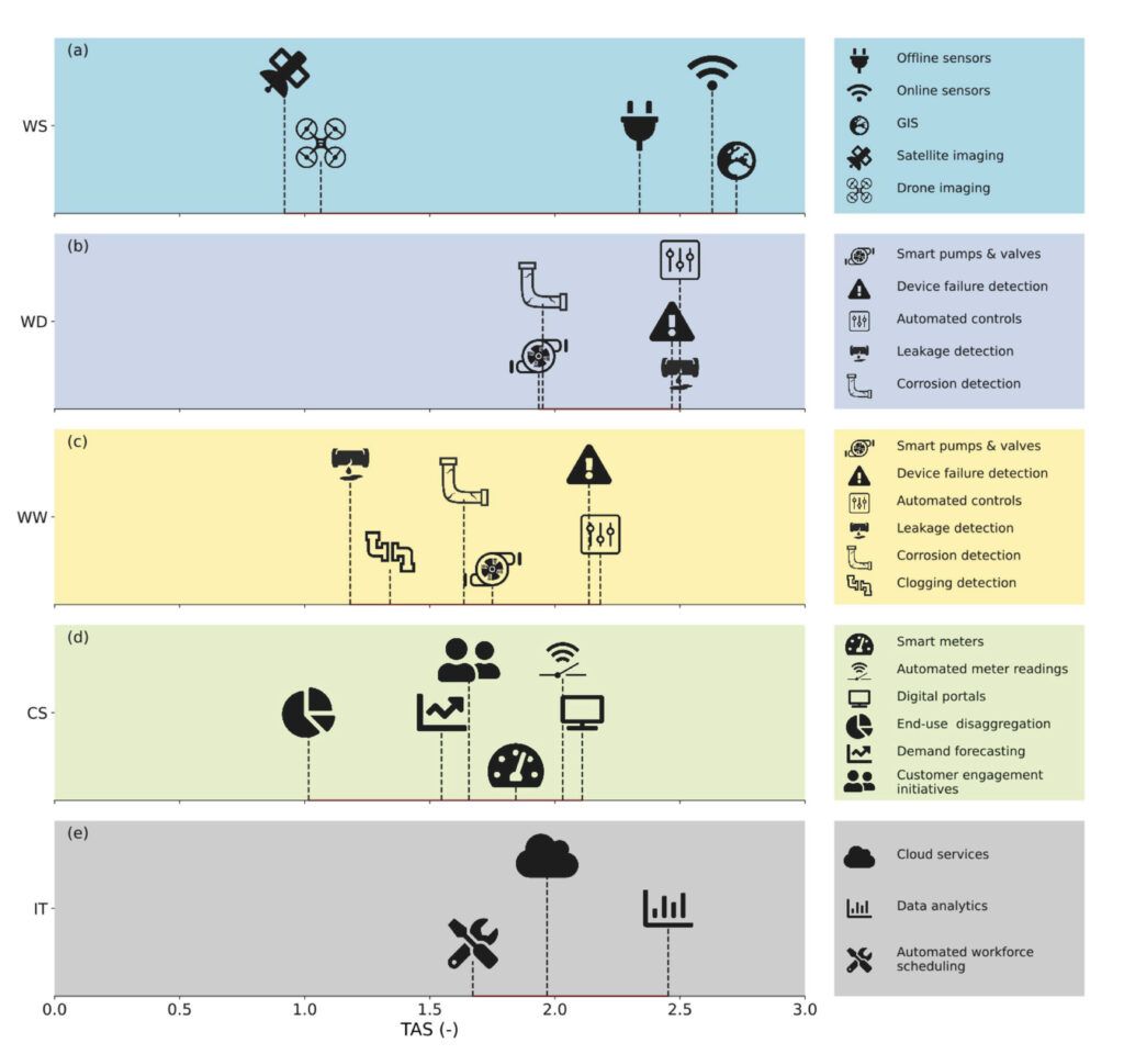 Penetration of digital technologies in different water utility subdivisions. The technology availability score (TAS) is computed for individual technologies and refers to their application to individual subdivisions in the entire water utility sector: a WS; b WD; c WW; d CD; and e IT. TAS values of 0 indicate low penetration and availability of a given technology, and values of 3 indicate high penetration and availability.