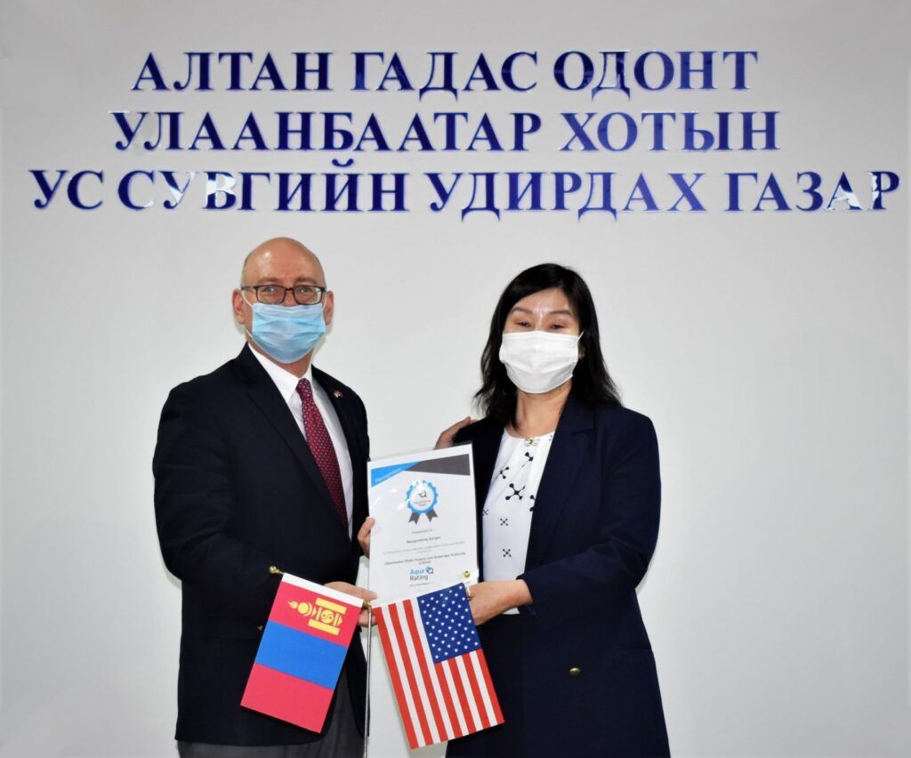 Pictured above: Mr. Ts.Torkhuu, Chairman of USUG (left) and Mr. Michael Klecheski, U.S Ambassador to Mongolia (right). The ambassador is shown presenting the USUG AquaRating certification seal to the chairman.