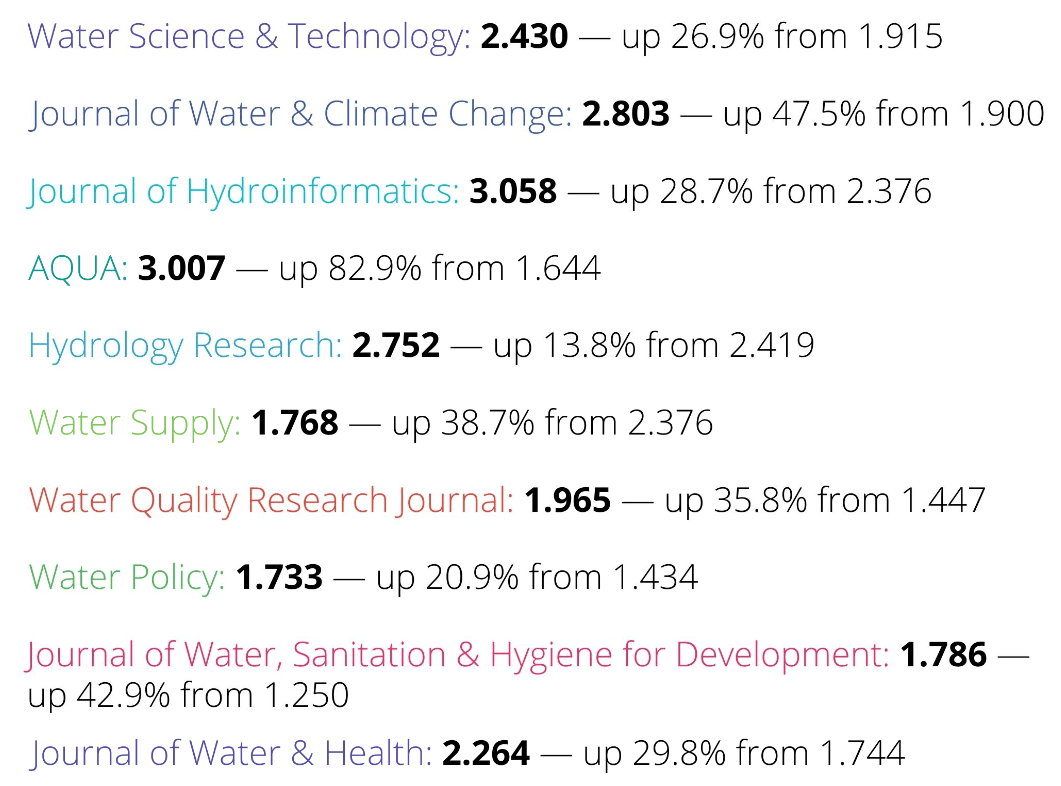 “The work of our journal Editor teams, combined with IWA Publishing’s transition to Open Access, have transformed our journals into truly global publications which serve the entire water community. The superb increase in the latest Impact Factor data reflects the enormous progress made in recent years.”