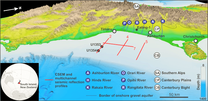 Fig. 1 Study area. Three-dimensional digital elevation model of the Canterbury Basin (Source: https://data/linz.govt.nz). The location of the rivers, onshore gravel aquifer, onshore well Ealing 1, CSEM and multichannel seismic reflection lines, and boreholes U1353 and U1354, is shown. https://www.nature.com/articles/s41467-020-14770-7
