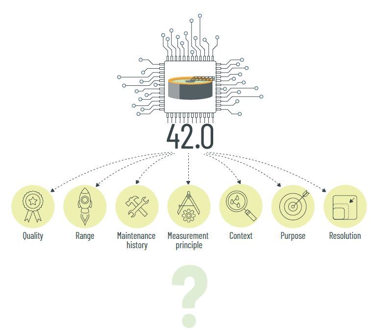 Image: Can we interpret the provided measurement equal to 42.0? We need to know a lot more to evaluate the information contained in sensor signals. The kind of descriptive data we need for interpretation is known as “meta-data” and includes the purpose of measurement, the measurement principle, the temporal and measurement resolution, sensor maintenance history, indicators of signal quality, and the spatial and temporal context of the measurement. © IWA 2021