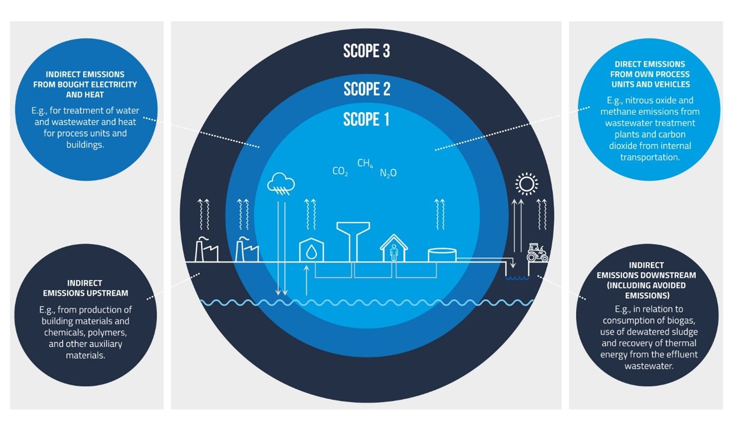 Figure 1: Definition of scope 1, 2 and 3 based in the water sector (figure is developed by EnviDan based on the Greenhouse Gas Protocol Standards).