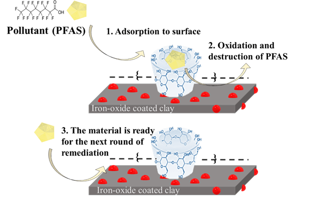 Depiction of the system working mechanism: 1. Pollutants separation and confinement; 2. Oxidation of the detained pollutants; 3. Regeneration of the system. Image courtesy of Dr. Samapti Kundu